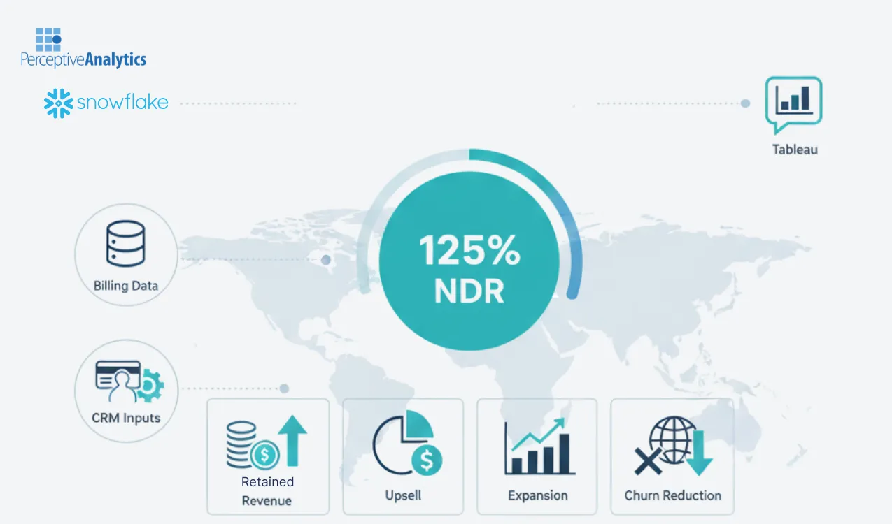 - Solution: A comprehensive Net Dollar Retention (NDR) analysis integrating customer usage, billing, and transaction data to quantify how revenue evolved across customer cohorts, industries, and regions. The analysis identified patterns of churn and growth, linked them to behavioral signals, and surfaced specific opportunities for retention and upsell.